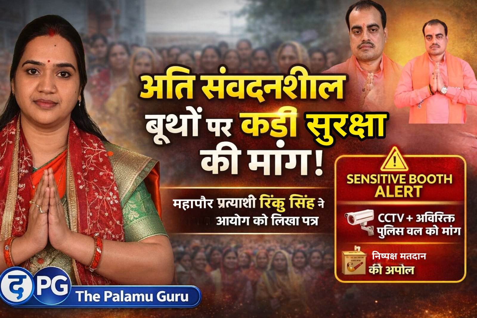 मेदिनीनगर (पलामू) ; आगामी मेदिनीनगर नगर निगम चुनाव को लेकर राजनीतिक सरगर्मी तेज हो गई है। इसी क्रम में महापौर पद की प्रत्याशी श्रीमती रिंकु सिंह ने चुनाव प्रक्रिया की निष्पक्षता और पारदर्शिता सुनिश्चित करने के उद्देश्य से भारत निर्वाचन आयोग, राज्य निर्वाचन आयोग झारखंड एवं जिला प्रशासन को पत्र भेजकर अति संवेदनशील मतदान केंद्रों पर विशेष सुरक्षा व्यवस्था लागू करने की मांग की है।श्रीमती सिंह ने 14 फरवरी 2026 को स्पीड पोस्ट के माध्यम से अपना आवेदन संबंधित अधिकारियों को प्रेषित किया है। इस पत्र की प्रतिलिपि उपायुक्त पलामू, पुलिस अधीक्षक तथा अनुमंडल पदाधिकारी को भी भेजी गई है।
